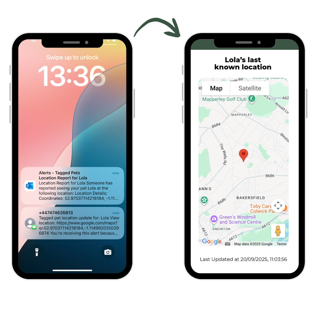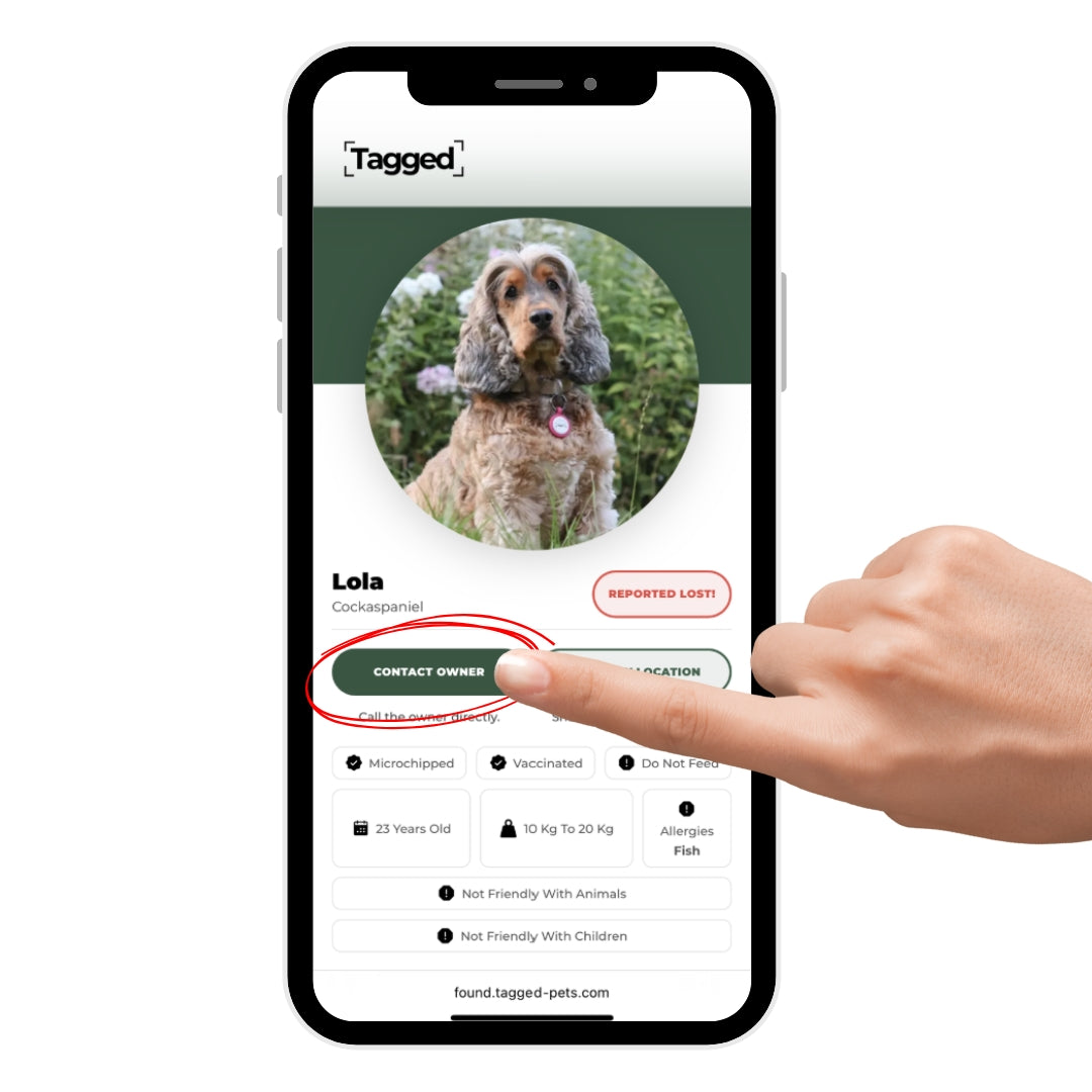 Mark your pet as lost instantly, alerting your community to immediately make contact via SMS and telephone to help bring them home.